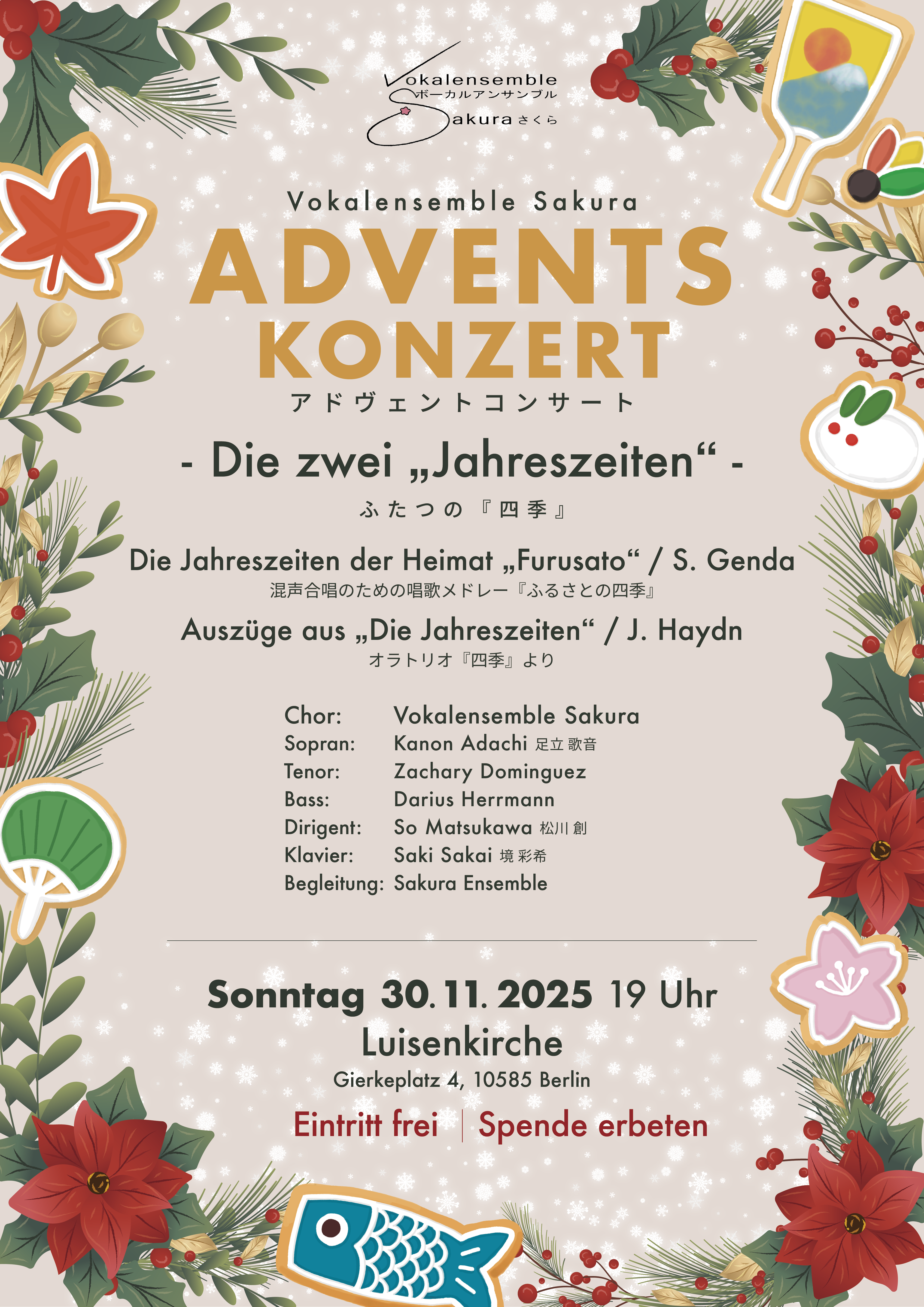 ボーカルアンサンブルさくら:アドベントコンサート 11月27日 19:30 Internationales Begegnungszentrum Wiesbadener Str. 18 14197 Berlin 11月30日 19:00 Luisenkirche Gierkeplatz 4 10585 Berlin |